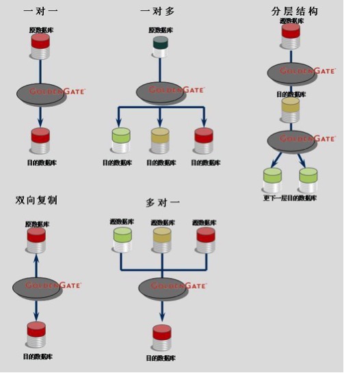 Oracle GoldenGate 支持多種拓撲結構,為用戶(hù)數據復制方案的靈活性、先 進(jìn)性奠定基礎,如圖所示: